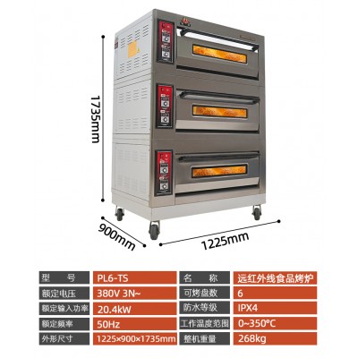 电烤炉系列电烤炉采用分层各自独立控制结构,每一层的及面火均可以控制,因而烘烤质量特别理想,本产品主要用于烘烤面包及饼食等,是中小型糕厂(店)及工矿企业机关,学校等单位食堂理想的设备。